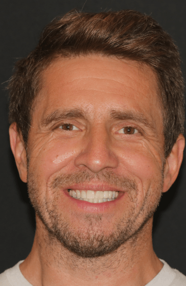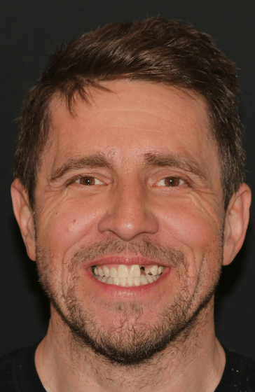 1.) Dariusz, frustrated with his upper jaw crossbite and missing front teeth, was overwhelmed by previous recommendations of major surgery and years of braces. Dr. Simon suggested the Six Month Smiles system to correct his teeth in a year, followed by an implant. In 11 months, the crossbite was fixed, and our team coordinated to place the implant perfectly. Dr. Neichen completed the implant in one visit, and Dr. Simon created a fixed dental bridge in two visits, resulting in a spectacular, natural-looking smile without surgery, thanks to our team’s collaboration.