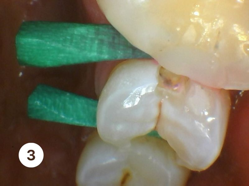 There are two kinds of cavities. Cavities on the outside surface and cavities between the teeth. Below is an example of a cavity between the teeth. When a patient eats sugar the germs in their mouth eat the sugar too and turn it into acid that eats a hole in the tooth. Once the hole starts more and more germs get into the hole and they make more acid and the cavity gets deeper and deeper and no amount of brushing or flossing can stop it.The only way to prevent this from happening is to eat sugar less often and use dental floss or an oral irrigator to clean between the teeth.